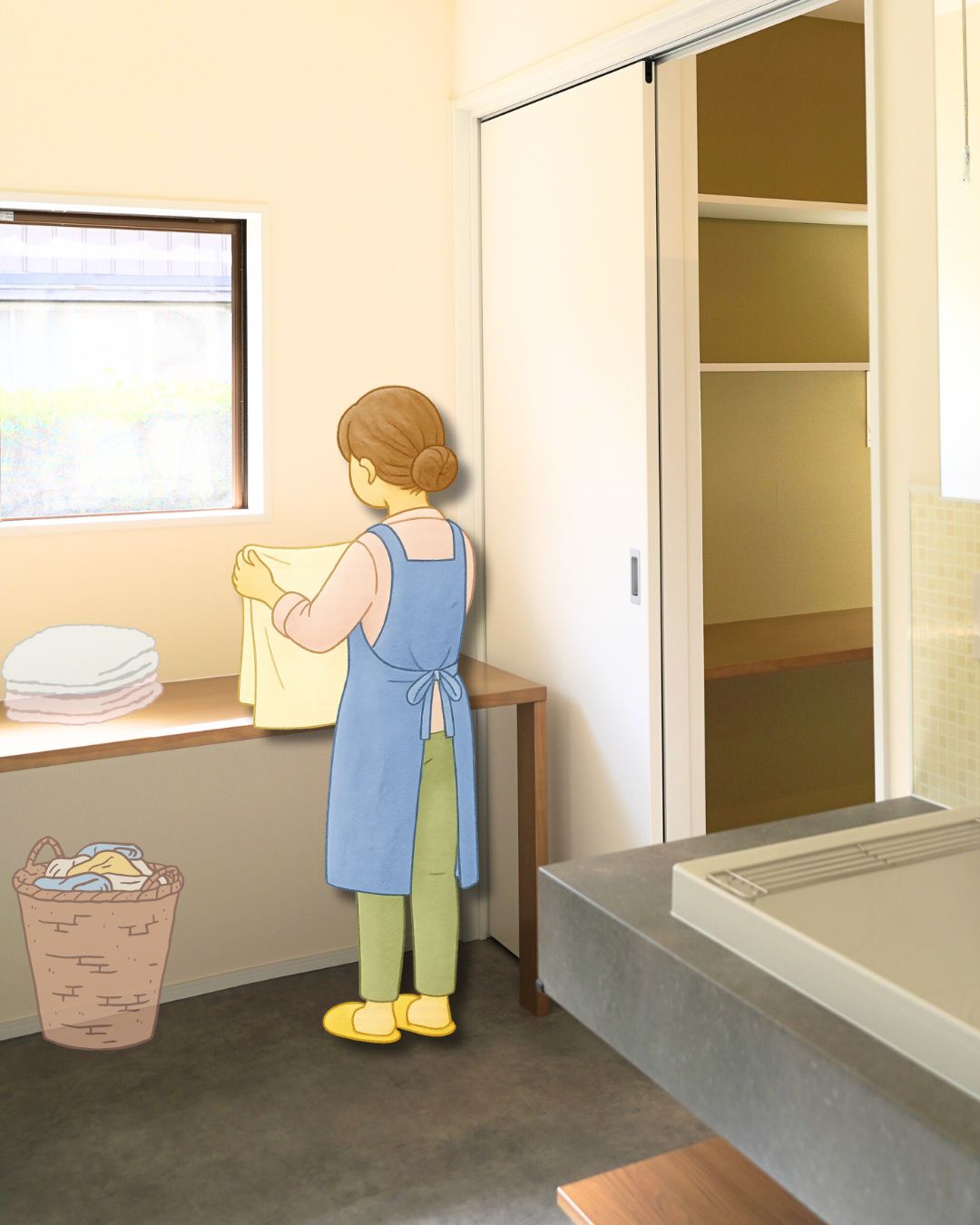 腰への負担も軽減され、洗濯物をリビングに持ち込まずに整理できるため、生活感を抑えたすっきりとした空間に。