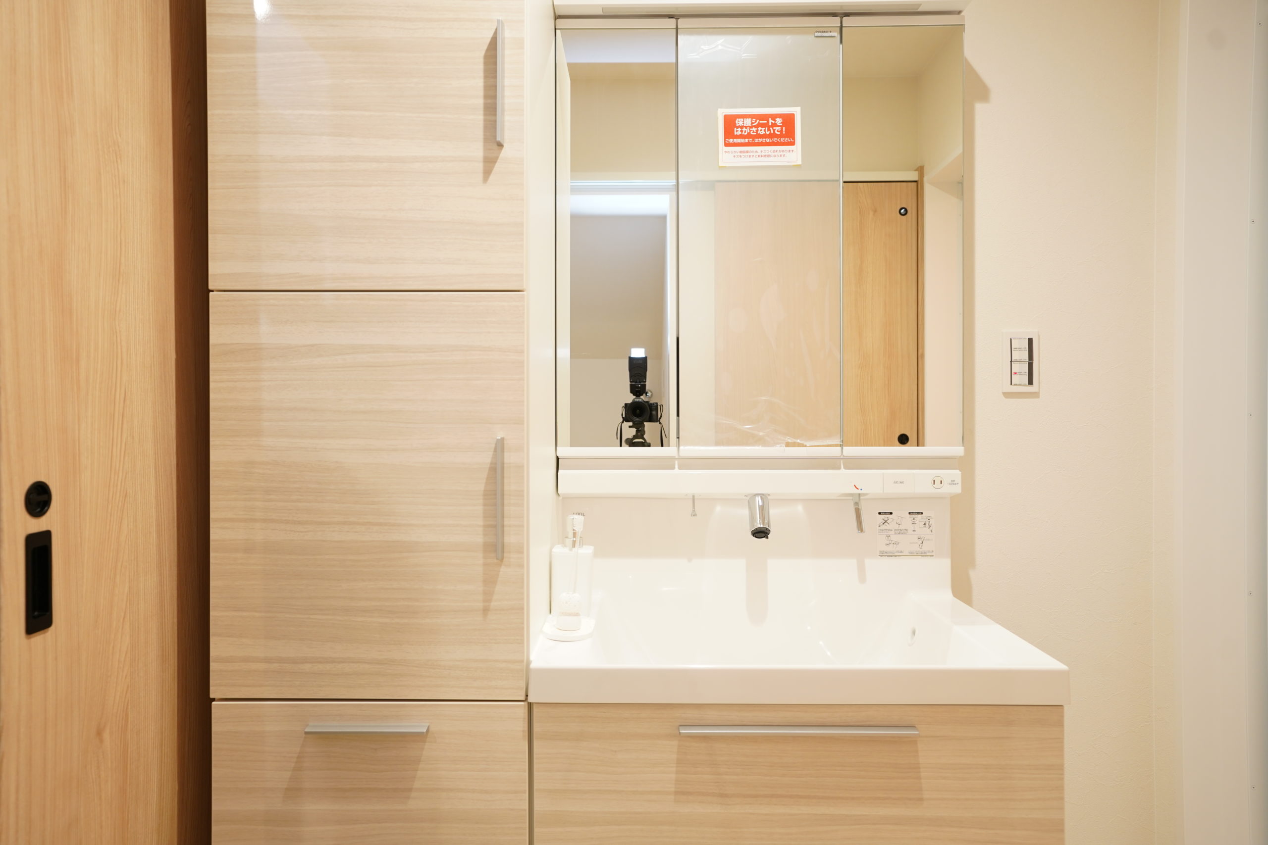 木目調の扉カラーを選び、周囲の内装とも自然になじむ仕上がりに。「洗面所=生活感」から、「洗面所=お気に入りの空間」へ。